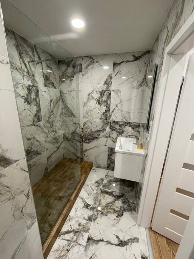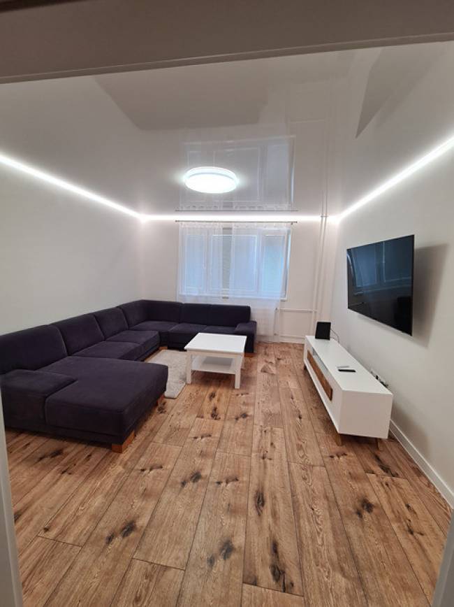Vyrovnanie podláh v celom byte nivelizáciou. Nové vinylové podlahy, znížené stropy technológia napínacie stropy so zabudovaným led osvetlením, stierky nové biele, nové interiérové dvere v bielom prevedení s obložením zárubne, plastové okná so žalúziami, nová kuchynská linka do tvaru L ( biely lesk) s led podsvietením kuchynskej linky so zabudovanými spotrebičmi ako je chladnička s mrazničkou, indukčná varná doska, elektrická rúra, digestor, čierny granitový drez s batériou, umývačka riadu, pračka zabudovaná v kuchynskej linke, vchodové bytové dvere sú bezpečnostné.