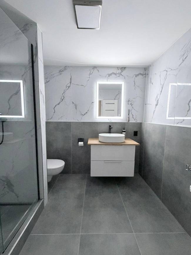 • priestrannú kúpeľňu s použitím nadštandardných materiálov – veľkoformátový obklad a dlažba, sprchový kút, WC Geberit