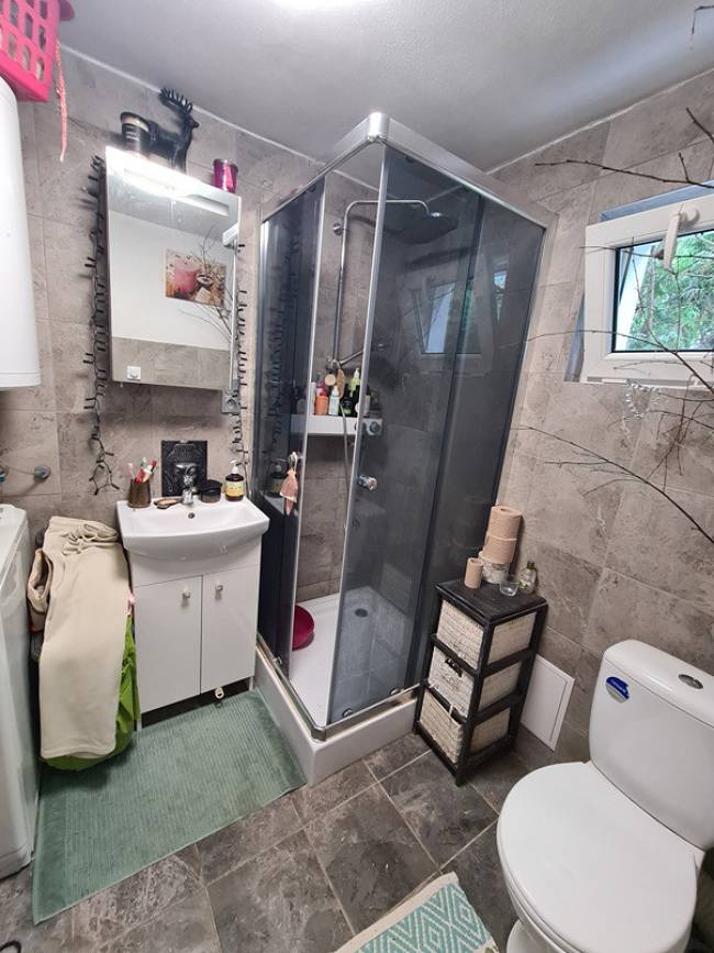 V spodnej časti je pivnica, ktorá momentálne slúži ako sklad. Sú tam 3 miestnosti. Tento priestor je možné využívať aj ako letnú kuchyňu. Po pár schodíkoch sa dostanete cez gang, ktorý je do tvaru L po obvode do hlavnej obytnej časti (spodná časť) kde je denná miestnosť s kuchynskou časťou a kúpeľňa s WC. Po schodisku sa dostanete do podkrovia, kde je jedna veľká miestnosť (využívaná ako spálňa) s výstupom na priestrannejší balkón.