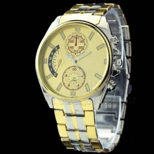 Predám nové elegantné analógové pánske náramkové hodinky s luxusným dizajnom v strieborno-zlatej kombinácii.