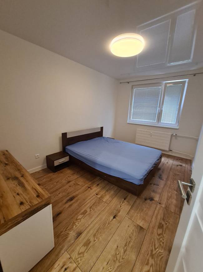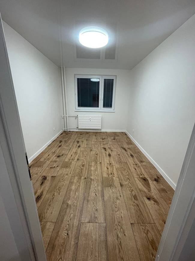 Vyrovnanie podláh v celom byte nivelizáciou. Nové vinylové podlahy, znížené stropy technológia napínacie stropy so zabudovaným led osvetlením, stierky nové biele, nové interiérové dvere v bielom prevedení s obložením zárubne, plastové okná so žalúziami, nová kuchynská linka do tvaru L ( biely lesk) s led podsvietením kuchynskej linky so zabudovanými spotrebičmi ako je chladnička s mrazničkou, indukčná varná doska, elektrická rúra, digestor, čierny granitový drez s batériou, umývačka riadu, pračka zabudovaná v kuchynskej linke, vchodové bytové dvere sú bezpečnostné.