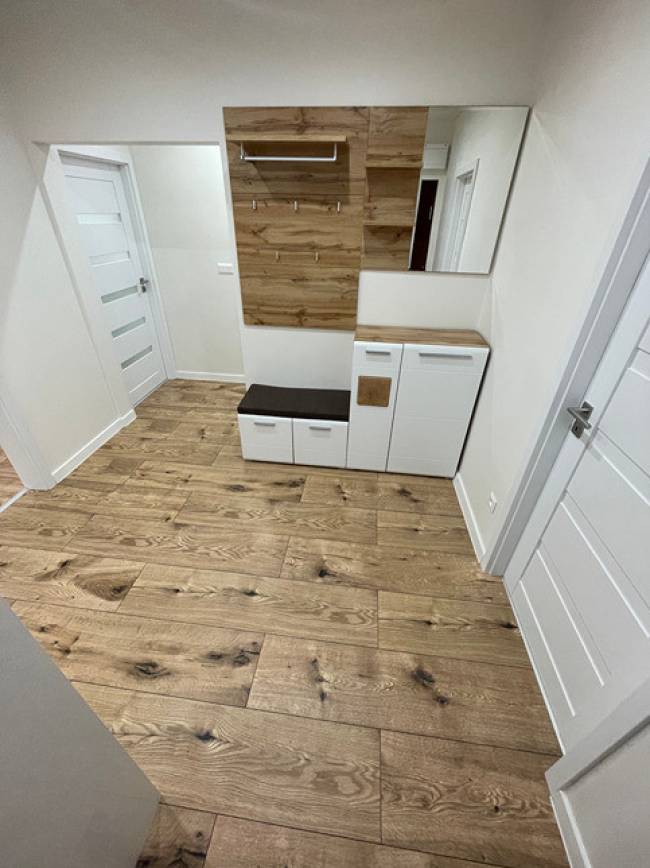 Popis bytu: izby sú neprechodné, nové rozvody elektriky, vody, odpadu. Nové vinylové podlahy, znížené stropy technológia napínacie stropy so zabudovaným led osvetlením, stierky nové biele, nové interiérové dvere s obložením zárubne, plastové okná so žalúziami, nová kuchynská linka do tvaru L (biely lesk) s led podsvietením kuchynskej linky, so zabudovanými spotrebičmi ako je chladnička s mrazničkou, indukčná varná doska, elektrická rúra, digestor, čierny granitový drez s batériou, umývačka riadu, pračka zabudovaná v kuchynskej linke, vchodové bytové dvere sú bezpečnostné. Na chodbe je vstavaná biela skriňa so zrkadlom a šatníková zostava. Kúpeľňa je murovaná s priestranným sprchovým kútom s vyhrievanou podlahou v kúpeľni a aj v sprchovom kúte. WC Geberit.
